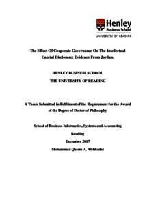 Alshhadat, m. Q. A. (2018) The effect of corporate governance on the Intellectual Capital disclosure; evidence from Jordan. PhD thesis, University of Reading. doi: 10.48683/1926.00080278