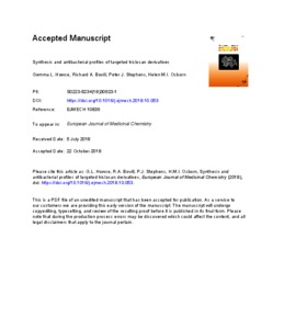 Howse, G. L., Bovill, R. A., Stephens, P. J. and Osborn, H. M. I. ORCID: https://orcid.org/0000-0002-0683-0457 (2019) Synthesis and antibacterial profiles of targeted triclosan derivatives. European Journal of Medicinal Chemistry, 162. pp. 51-58. ISSN 0223-5234 doi: 10.1016/j.ejmech.2018.10.053