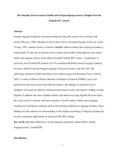 Foreign language learning in classroom settings has long been found to be associated with anxiety (Horwitz, 1986). Though it is known that sources of foreign language anxiety are varied (Young, 1991), whether anxiety is related to learners’ inherent beliefs about language learning is understudied. To this end, the present study examines the possible relationship between learner beliefs and language anxiety in the under-researched Turkish EFL context. A population of university-level Turkish EFL learners (n=153) completed the Beliefs about Language Learning Inventory (BALLI) and the Foreign Language Classroom Anxiety scale (FLCAS). The underlying constructs in both instruments were explored using an Exploratory Factor Analysis (EFA). A series of Pearson Product-Moment Correlation Coefficient (PPMCC) tests were performed on the factor scores from both instruments. The findings revealed that fear of ambiguity was positively linked to classroom performance anxiety and negative feelings towards English. In addition, the more confident learners feel themselves using English, the more desire they seem to have to interact with native speakers. Overall, positive beliefs about language learning may be helpful in reducing anxiety and boosting confidence in language learning. These findings not only enhance our understanding of the complex psychology of language learning but also have important implications for instructed EFL/ESL settings.