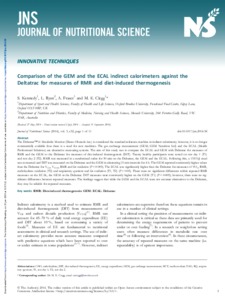 Kennedy, S., Ryan, L., Fraser, A. and Clegg, M. E. (2014) Comparison of the GEM and the ECAL indirect calorimeters against the Deltatrac for measures of RMR and diet-induced thermogenesis. Journal of Nutritional Science, 3. e52. ISSN 2048-6790 doi: 10.1017/jns.2014.58
