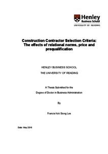 Lee, F. K. S. (2016) Construction contractor selection criteria: the effects of relational norms, price and prequalification. DBA thesis, Henley Business School, University of Reading.