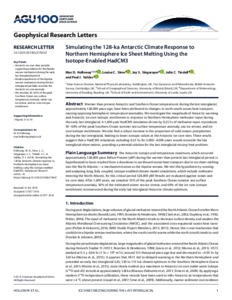 Holloway, M. D., Sime, L. C., Singarayer, J. S., Tindall, J. C. and Valdes, P. J. (2018) Simulating the 128-ka Antarctic climate response to Northern Hemisphere ice sheet melting using the isotope-enabled HadCM3. Geophysical Research Letters, 45 (21). 11,921-11,929. ISSN 0094-8276 doi: 10.1029/2018gl079647