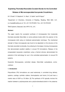 The paper reports the successful synthesis of microcapsules that incorporate thermally-reversible Diels-Alder or oxime-urethane bonds within the polymer of the microcapsule shell using an interfacial polymerisation technique. The mechanical strength of these microcapsules was found to be dependent on the structure of the thermally-reversible functionality, thus allowing for the design of strong microcapsules that demonstrated excellent stability in one-pot PU formulations. Release of the encapsulated isocyanate crosslinkers using a thermal stimulus demonstrated the potential of this technology for use in the controlled polymerisation of one-pot PU systems.