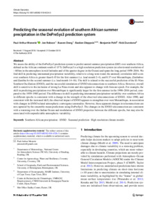 We assess the ability of the DePreSys3 prediction system to predict austral summer precipitation (DJF) over southern Africa, defined as the African continent south of 15°S. DePresys3 is a high resolution prediction system (at a horizontal resolution of ~ 60 km in the atmosphere in mid-latitudes and of the quarter degree in the Ocean) and spans the long period 1959–2016. We find skill in predicting interannual precipitation variability, relative to a long-term trend; the anomaly correlation skill score over southern Africa is greater than 0.45 for the first summer (i.e. lead month 2–4), and 0.37 over Mozambique, Zimbabwe and Zambia for the second summer (i.e. lead month 14–16). The skill is related to the successful prediction of the El-Nino Southern Oscillation (ENSO), and the successful simulation of ENSO teleconnections to southern Africa. However, overall skill is sensitive to the inclusion of strong La-Nina events and also appears to change with forecast epoch. For example, the skill in predicting precipitation over Mozambique is significantly larger for the first summer in the 1990–2016 period, compared to the 1959–1985 period. The difference in skill in predicting interannual precipitation variability over southern Africa in different epochs is consistent with a change in the strength of the observed teleconnections of ENSO. After 1990, and consistent with the increased skill, the observed impact of ENSO appears to strengthen over west Mozambique, in association with changes in ENSO related atmospheric convergence anomalies. However, these apparent changes in teleconnections are not captured by the ensemble-mean predictions using DePreSys3. The changes in the ENSO teleconnection are consistent with a warming over the Indian Ocean and modulation of ENSO properties between the different epochs, but may also be associated with unpredictable atmospheric variability.