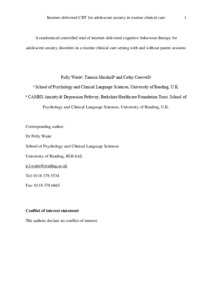 Waite, P. ORCID: https://orcid.org/0000-0002-1967-8028, Marshall, T. and Creswell, C. (2019) A randomized controlled trial of internet-delivered cognitive behaviour therapy for adolescent anxiety disorders in a routine clinical care setting with and without parent sessions. Child and Adolescent Mental Health, 24 (3). pp. 242-250. ISSN 1475-3588 doi: 10.1111/camh.12311