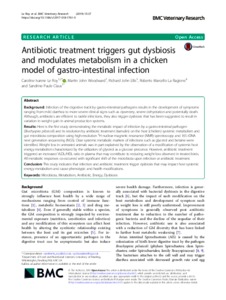 Le Roy, C. I., Woodward, M. J., Ellis, R. J., La Ragione, R. M. and Claus, S. P. (2019) Antibiotic treatment triggers gut dysbiosis and modulates metabolism in a chicken model of gastro-intestinal infection. BMC Veterinary Research, 15. 37. ISSN 1746-6148 doi: 10.1186/s12917-018-1761-0
