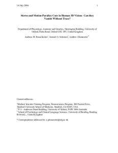 Rauschecker, A. M., Solomon, S. G. and Glennerster, A. ORCID: https://orcid.org/0000-0002-8674-2763 (2006) Stereo and motion parallax cues in human 3D vision: can they vanish without a trace? Journal of Vision, 6 (12). pp. 1471-1485. ISSN 1534-7362 doi: 10.1167/6.12.12