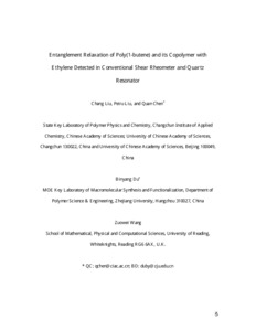 Liu, C., Liu, P., Chen, Q., Du, B. and Wang, Z. (2019) Entanglement relaxation of poly(1-butene) and its copolymer with ethylene detected in conventional shear rheometer and quartz resonator. Journal of Rheology, 63 (1). pp. 167-177. ISSN 0148-6055 doi: 10.1122/1.5051041