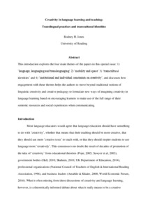 This introduction explores the four main themes related to creativity in language learning and teaching: 1) ‘language, languaging and translanguaging’ 2) ‘mobility and space’ 3) ‘transcultural identities’ and 4) ‘institutional and individual constraints on creativity’, and discusses how engagement with these themes helps the authors to move beyond traditional notions of linguistic creativity and creative pedagogy to formulate new ways of imagining creativity in language learning based on encouraging learners to make use of the full range of their semiotic resources and social experiences when communicating.