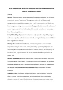Purpose: This paper focuses on emerging market firms that internationalize into advanced economies by means of acquisitions. This paper aims to describe and discuss brand management in post-acquisition integration from a multi-level perspective and identify how brand management strategy can be constructed. The paper takes into account the influences of country image, corporate brand and brand portfolio to obtain a granular view in managing brand after such acquisitions. Design/Methodology/Approach: A multiple case study approach is adopted. By using case studies and storytelling qualitative research methods, our empirical setting consists of Chinese firms’ acquisitions in Germany. Findings: We identified three mechanisms for brand management in post-acquisition integration of emerging market firms, namely transferring, dynamically redeploying and categorizing that underpin the interconnection and combined influence of country image on the national level, corporate brand on the organizational level and brand portfolio on the product level. Practical implications: Brand has been viewed as a strategic asset in Chinese cross-border acquisitions. Brand management is a dynamic process that involves learning and interaction between the acquirer and target. Our research offers a practical guideline for both acquirers and targets in managing brand amid emerging market firms’ acquisition in advanced economies. Originality/Value: Our findings shed important light on brand management strategy in Chinese overseas acquisitions in particular, and emerging market firms venturing into advanced economies in general. The interlinking of country, company and product levels presents new ideas to brand literature, and the setting with Chinese firms acquiring German companies constitutes an important contribution to understand how firms from emerging economies may pursue branding strategies different to present knowledge from advanced economy firms.