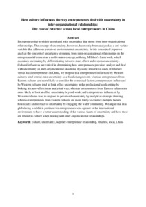 Liu, Y. and Almor, T. (2016) How culture influences the way entrepreneurs deal with uncertainty in inter-organizational relationships: the case of returnee versus local entrepreneurs in China. International Business Review, 25 (1). pp. 4-14. ISSN 0969-5931 doi: 10.1016/j.ibusrev.2014.11.002