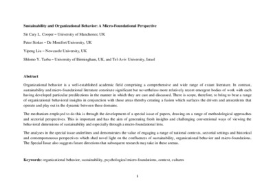 Cooper, C. L., Stokes, P., Liu, Y. and Tarba, S. Y. (2017) Sustainability and organizational behavior: a micro-foundational perspective. Journal of Organizational Behavior, 38 (9). pp. 1297-1301. ISSN 1099-1379 doi: 10.1002/job.2242