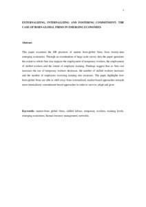 This paper examines the HR practices of mature born-global firms from twenty-nine emerging economies. Through an examination of large scale survey data the paper questions the extent to which firm size impacts the employment of temporary workers, the employment of skilled workers and the extent of employee training. Findings suggest that as firm size increases the use of temporary workers decreases, the number of skilled workers increases and the number of employees receiving training also increases. The paper highlights how born-global firms are able to shift away from externalized, market-based approaches towards more internalized, commitment-based approaches in order to survive, adapt and grow.
