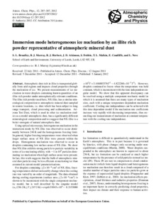 Broadley, S. L., Murray, B. J., Herbert, R. J., Atkinson, J. D., Dobbie, S., Malkin, T. L., Condliffe, E. and Neve, L. (2012) Immersion mode heterogeneous ice nucleation by an illite rich powder representative of atmospheric mineral dust. Atmospheric Chemistry and Physics, 12. pp. 287-307. ISSN 1680-7316 doi: 10.5194/acp-12-287-2012