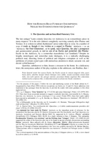 The late antique comedy Querolus (or Aulularia) makes a number of references to the ways in which the text of an inscribed urn was read. This is important, hitherto neglected evidence for the way in which encounters and interactions with inscribed objects, especially from a funerary sphere, were imagined in the Roman world. Based on an in-depth discussion of relevant passages, initial conclusions are drawn and linked to related phrases and passages in surviving epigraphic evidence, giving reason to rethink the multi-layered, complex sensuous experience that is commonly just referred to as ‘reading inscriptions’.