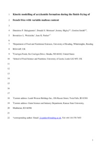 Balagiannis, D. P., Mottram, D. S., Higley, J., Smith, G., Wedzicha, B. L. and Parker, J. K. ORCID: https://orcid.org/0000-0003-4121-5481 (2019) Kinetic modelling of acrylamide formation during the finish-frying of french fries with variable maltose content. Food Chemistry, 284. pp. 236-244. ISSN 0308-8146 doi: 10.1016/j.foodchem.2019.01.075