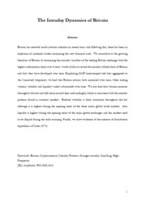 Bitcoin has received much investor attention in recent years and following this, there has been an explosion of academic studies examining this new financial asset. We contribute to the growing literature of Bitcoin by examining the intraday variables of the leading Bitcoin exchange with the highest information share over 4 years’ worth of data to reveal the intraday stylized facts of Bitcoin and how they have developed over time. Employing GMT-timestamped tick data aggregated to the 5-mintuely frequency, we find that Bitcoin returns have increased over time, while trading volume, volatility and liquidity varied substantially over time. We also find that volume increases throughout the day and falls from around 4pm until midnight, which is consistent with the intraday patterns found in currency markets. Realised volatility is fairly consistent throughout the day although it is highest during the opening times of the three major global stock markets. Also liquidity is highest during the opening times of the major global exchanges and the markets tend to be illiquid during the early morning. Finally, we show evidence of the mixture of distribution hypothesis of Clark (1973).