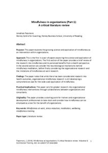 Purpose The purpose of this paper is to explore the growing science and application of mindfulness as an intervention within organizations. Design/methodology/approach This is the first in a pair of papers exploring the science and application of mindfulness in organizations. The first section of the paper provides a brief review of the research into mindfulness and its perceived benefits from a health perspective. In the second section, the author considers the neurobiological mechanisms behind mindfulness meditation, before finally considering the organizational research and the limitations of mindfulness at work research. Findings The paper notes that while there has been considerable research into health outcomes, organizational mindfulness research is still developing a comprehensive case for the wide-scale application of mindfulness. Research limitations/implications The paper calls for greater research into organizational mindfulness interventions through collaborations between organizations and consultants. Practical implications The paper calls for organizations to adopt an evidence-led approach to using mindfulness and evaluate its impact on employees and organizational performance. Originality/value The paper provides a starting point for trainers and organizational development professionals to take stock and consider how mindfulness can be employed as a tool for the benefit of organizations.