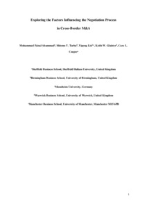 Ahammad, M. F., Tarba, S. Y., Liu, Y., Glaister, K. W. and Cooper, C. L. (2016) Exploring the factors influencing the negotiation process in cross-border M&A. International Business Review, 25 (2). pp. 445-457. ISSN 0969-5931 doi: 10.1016/j.ibusrev.2015.06.001