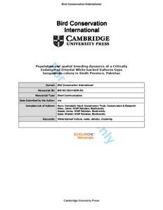 Murn, C. ORCID: https://orcid.org/0000-0003-4064-6060, Saeed, U., Khan, U. and Iqbal, S. (2015) Population and spatial breeding dynamics of a Critically Endangered Oriental White-backed Vulture Gyps bengalensis colony in Sindh Province, Pakistan. Bird Conservation International, 25 (4). pp. 415-425. ISSN 0959-2709 doi: 10.1017/S0959270914000483