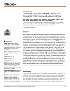Many members of the public and important stakeholders operating at the upper end of the food chain, may be unfamiliar with how food is produced, including within modern animal production systems. The intensification of production is becoming increasingly common in modern farming. However, intensive systems are particularly susceptible to production diseases, with potentially negative consequences for farm animal welfare (FAW). Previous research has demonstrated that the public are concerned about FAW, yet there has been little research into attitudes towards production diseases, and their approval of interventions to reduce these. This research explores the public’s attitudes towards, and preferences for, FAW interventions in five European countries (Finland, Germany, Poland, Spain and the UK). An online survey was conducted for broilers (n = 789), layers (n = 790) and pigs (n = 751). Data were analysed by means of Kruskal-Wallis ANOVA, exploratory factor analysis and structural equation modelling. The results suggest that the public have concerns regarding intensive production systems, in relation to FAW, naturalness and the use of antibiotics. The most preferred interventions were the most “proactive” interventions, namely improved housing and hygiene measures. The least preferred interventions were medicine-based, which raised humane animal care and food safety concerns amongst respondents. The results highlighted the influence of the identified concerns, perceived risks and benefits on attitudes and subsequent behavioural intention, and the importance of supply chain stakeholders addressing these concerns in the subsequent communications with the public.