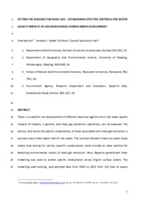 Worrall, F., Wade, A. ORCID: https://orcid.org/0000-0002-5296-8350, Davies, R. J. and Hart, A. (2019) Setting the baseline for shale gas - establishing effective sentinels for water quality impacts of unconventional hydrocarbon development. Journal of Hydrology, 571. pp. 516-527. ISSN 0022-1694 doi: 10.1016/j.jhydrol.2019.01.075