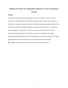 Even though small talk has been investigated in a variety of business contexts and service encounters, it is understudied in instructional settings. This paper explores the occurrence of small talk in a university chemistry lab between a Chinese international teaching assistant (ITA) and American students. Drawing on naturally occurring interaction data from a conversation analysis perspective, triangulated by interview data and researcher field notes, the study describes the particular functions of small talk, such as identity affiliation and rapport management through humorous small talk. The findings are discussed in relation to ITA identity and professional development and the role of small talk in instructional discourse.