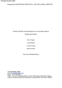 Chung, K. L. ORCID: https://orcid.org/0000-0003-0012-8752, Morshidi, I., Yoong, L. C. and Thian, K. N. (2019) The role of the dark tetrad and impulsivity in social media addiction: findings from Malaysia. Personality and Individual Differences, 143. pp. 62-67. ISSN 0191-8869 doi: 10.1016/j.paid.2019.02.016