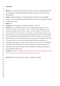 Objective: To compare food and nutrient intake of infants aged 6-12 months following a baby-led complementary feeding (BLCF) approach to infants who followed a standard weaning (SW) approach. Design: Participants completed an online questionnaire consisting of socio-demographic questions, a 28-day food frequency questionnaire (FFQ) and a sample of participants completed a 24-hour dietary recall. Setting: UK. Participants: 134 infants aged 6-12 months (n=88, BLCF; n=46, SW). Results: There was no difference between weaning method and food groups for “fruits”, “vegetables”, “all fish”, “meat and fish”, “sugary” or “starchy” foods. The SW group were offered “fortified infant cereal” (p<.001), “salty snacks” at 6-8 months (p=.03), “dairy and dairy based desserts” at 9-12 months (p=.04) and pre-prepared infant food at all ages (p<.001) more often that the BLCF group. The SW group were offered “oily fish” at all ages (p<.001) and 6-8 months (p=.01), and “processed meats” at all ages (p<.001), 6-8 months (p=.003), and 9-12 months (p<.001) less often than the BLCF group. In the BLCF group there was a significantly greater intake of sodium (p=.028) and fat from food (p=.035), and a significantly lower intake of iron from milk (p=.012) and free sugar in the 6-8 month subgroup (p=.03) compared to the SW group. Iron intake was below the RNI for both groups and sodium was above the RNI in the BLCF group. Conclusion: Compared to the SW group the BLCF group were offered foods higher in sodium and lower in iron, however the foods offered contained less free sugar.