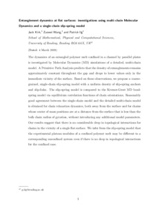 Kirk, J., Wang, Z. and Ilg, P. ORCID: https://orcid.org/0000-0002-7518-5543 (2019) Entanglement dynamics at flat surfaces: investigations using multi-chain molecular dynamics and a single-chain slip-spring model. The Journal of Chemical Physics, 150 (9). 094906. ISSN 0021-9606 doi: 10.1063/1.5045301