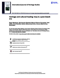 Matthews, R. ORCID: https://orcid.org/0000-0002-8316-4312, Rasheed, Q. H., Palmero Fernandez, M., Fobbe, S., Novacek, K., Mohammed-Amin, R., Muhl, S. and Richardson, A. ORCID: https://orcid.org/0000-0002-7376-8948 (2020) Heritage and cultural healing: Iraq in a post-Daesh era. International Journal of Heritage Studies, 26 (2). pp. 120-141. ISSN 1470-3610 doi: 10.1080/13527258.2019.1608585