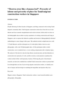 Hamid, W. and Tutt, D. ORCID: https://orcid.org/0000-0001-9216-8617 (2019) “Thrown away like a banana leaf”: precarity of labour and precarity of place for Tamil migrant construction workers in Singapore. Construction Management and Economics, 37 (9). pp. 513-536. ISSN 0144-6193 doi: 10.1080/01446193.2019.1595075