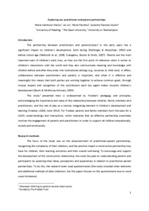 Kambouri-Danos, M. ORCID: https://orcid.org/0000-0001-5591-9418, Liu, J., Pieridou, M. and Quinn, S. F. (2018) Exploring our practitioner and parent partnerships. Early Years Educator (EYE), 19 (10). pp. 26-29. ISSN 1465-931X doi: 10.12968/eyed.2018.19.10.26