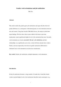 This article studies the gender gap in job satisfaction and argues that the observed gender difference is a consequence of the heterogeneity in work orientations between men and women. Using data from the 2006 Skills Survey, the analysis yields three major findings. The first shows that women, either in full-time or part-time employment, report significantly higher levels of job satisfaction than men. Secondly, work orientations are closely associated with one’s job satisfaction and their relationships vary significantly across men, women full-time and part-time workers. Finally, and most importantly, the observed gender satisfaction differential is eliminated once work orientations are taken into consideration.