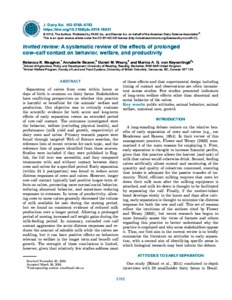 Meagher, R. K., Beaver, A., Weary, D. M. and von Keyserlingk, M. A. G. (2019) A systematic review of the effects of prolonged cow-calf contact on behavior, welfare, and productivity. Journal of Dairy Science, 102 (7). pp. 5765-5783. ISSN 0022-0302 doi: 10.3168/jds.2018-16021