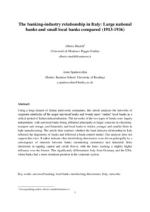 Rinaldi, A. and Spadavecchia, A. (2021) The banking-industry relationship in Italy: large national banks and small local banks compared (1913-1936). Business History, 63 (6). pp. 988-1006. ISSN 1743-7938 doi: 10.1080/00076791.2019.1598975