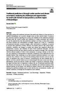Salite, D. (2019) Traditional predication of drought under weather and climate uncertainty: analyzing the challenges and opportunities for small-scale farmers in Gaza province, southern region of Mozambique. Natural Hazards, 96 (3). pp. 1289-1309. ISSN 1573-0840 doi: 10.1007/s11069-019-03613-4