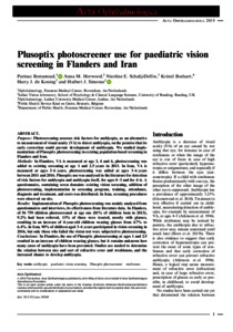 Bostamzad, P., Horwood, A. M. ORCID: https://orcid.org/0000-0003-0886-9686, Schalij-Delfos, N. E., Boelaert, K., Koning, H. J. and Simonsz, H. J. (2020) Plusoptix photoscreener use for paediatric vision screening in Flanders and Iran. Acta Ophthalmologica, 98 (1). pp. 80-88. ISSN 175-3768 doi: 10.1111/aos.14144