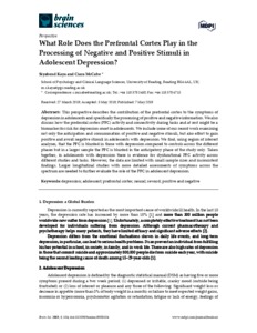 This perspective describes the contribution of the prefrontal cortex to the symptoms of depression in adolescents and specifically the processing of positive and negative information. We also discuss how the prefrontal cortex (PFC) activity and connectivity during tasks and at rest might be a biomarker for risk for depression onset in adolescents. We include some of our recent work examining not only the anticipation and consummation of positive and negative stimuli, but also effort to gain positive and avoid negative stimuli in adolescents with depression. We find, using region of interest analyses, that the PFC is blunted in those with depression compared to controls across the different phases but in a larger sample the PFC is blunted in the anticipatory phase of the study only. Taken together, in adolescents with depression there is evidence for dysfunctional PFC activity across different studies and tasks. However, the data are limited with small sample sizes and inconsistent findings. Larger longitudinal studies with more detailed assessments of symptoms across the spectrum are needed to further evaluate the role of the PFC in adolescent depression.