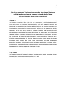 Self-initiated expatriates (SIEs) who work for a subsidiary of a multinational enterprise from their country of origin and hence are familiar with both countries’ language and culture can be expected to act as boundary-spanners between the assigned expatriates sent from the parent country and host country nationals, and between the headquarters and the subsidiary. We develop a new model of boundary-spanning that encompasses both individual and organizational antecedents and validate the model using survey data from Japanese-affiliated companies in China. We find that familiarity with Chinese language and culture and the potential dual allegiance of SIEs contribute to enhancing their boundary-spanning behavior. We also find that relationships of trust among the parties concerned (social capital) and global career opportunities for such self-initiated expatriates (geocentric staffing) have positive influences on their dual allegiance. Finally, normative and systems integration of human resource management are associated with increasing levels of social capital and geocentric staffing.