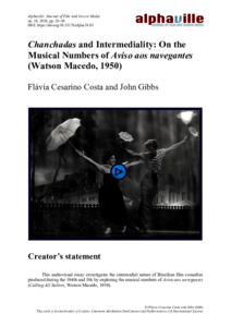 This audiovisual essay explores the intermedial nature of Brazilian film comedies produced during the 1940s and 1950s, by exploring the musical numbers of Aviso aos Navegantes (Watson Macedo, Atlântida Cinematográfica, 1950). Brazilian cinema of this period is a privileged arena of different media strategies. Its ‘mixed’ style is informed by Hollywood cinema but also by the domestic influence of radio, carnival, and by the local forms of comic staging of the teatro de revista (the Brazilian equivalent of music hall or vaudeville). Of particular interest in this regard are the chanchadas, a body of films made between the mid-1930s and the early 1960s, that presented musical performances intertwined with comic situations, slender narrative lines and strong connections with the world of carnival. Our aim is to show how the relationships between the different forms of cultural production in 1950s Brazil can be identified in a specific chanchada, opening a dialogue between musical performances on stage, over the radio, at carnival and on screen. The essay also examines similarities and differences between chanchadas and Hollywood musical comedy tradition. One area explored is integration, both in the sense in which it is often used in film studies, to discuss the relationship between the numbers and the narrative, and in reflecting on whether the different elements which feed into the numbers of Aviso aos Navegantes are seamlessly combined in the film. Despite the huge popular success of his films, Watson Macedo was considered by many as the most “Americanized” of the directors of that period, adhering less to the critical mechanisms of parody than was the case with his contemporaries. However, if we pay attention to Macedo’s musical numbers, it is evident that these performances are not imperfect copies of Hollywood originals, but have a logic of their own. The audiovisual essay complements Flavia Cesarino Costa’s other article for this issue of Alphaville, ‘Building an integrated history of musical numbers in Brazilian chanchadas’, by exploring related ideas in the context of a single film. As well as the interest of the essay’s own exploration and argument, the pairing of essays – traditional and videographic – enables readers of the special issue to pursue their thinking about chanchadas and intermediality with specific audiovisual material in front of them.