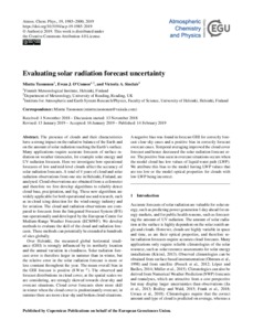 Tuononen, M., O'Connor, E. J. and Sinclair, V. A. (2019) Evaluating solar radiation forecast uncertainty. Atmospheric Chemistry and Physics, 19. pp. 1985-2000. doi: 10.5194/acp-19-1985-2019