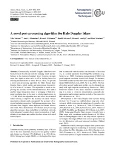 Vakkari, V., Manninen, A. J., O'Connor, E., Schween, J. H. and van Zyl, P. G. (2019) A novel post-processing algorithm for Halo Doppler lidars. Atmospheric Measurement Techniques, 12 (2). pp. 839-852. ISSN 1867-8548 doi: 10.5194/amt-12-839-2019