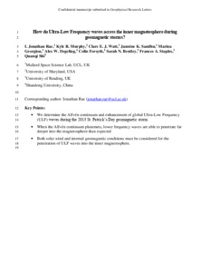 Rae, I. J., Murphy, K. R., Watt, C. E. J., Sandhu, J. K., Georgiou, M., Degeling, A. W., Forsyth, C., Bentley, S. N., Staples, F. A. and Shi, Q. (2019) How do ultra-low frequency waves access the inner magnetosphere during geomagnetic storms? Geophysical Research Letters, 46 (19). pp. 10699-10709. ISSN 0094-8276 doi: 10.1029/2019GL082395