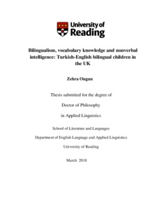 Ongun, Z. (2018) Bilingualism, vocabulary knowledge and nonverbal intelligence: Turkish-English bilingual children in the UK. PhD thesis, University of Reading.