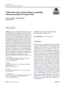 This study establishes and empirically explores the relationship between knowledge, cultural diversity and various entrepreneurial outcomes across European cities in 2008–2010. We demonstrate that the mechanism of knowledge spillover entrepreneurship is contextual and contend that cultural diversity and knowledge have differential impact on entrepreneurial outcomes across cities and countries. Cities with high cultural diversity provide more opportunities for entrepreneurship in sectors where technology and knowledge play more important role. While in technology-based sectors, we observe a decline in employment, in cities where cultural diversity is moderately high, this effect is counteracted by an increase in demand for skilful labour that is more concentrated in culturally diverse contexts. Implications for regional and national policy makers and international entrepreneurs are offered.