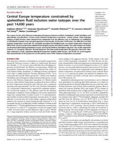 Affolter, S., Häuselmann, A., Fleitmann, D., Edwards, R. L., Cheng, H. and Leuenberger, M. (2019) Central Europe temperature constrained by speleothem fluid inclusion water isotopes over the past 14,000 years. Science Advances, 5 (6). eaav3809. ISSN 2375-2548 doi: 10.1126/sciadv.aav3809