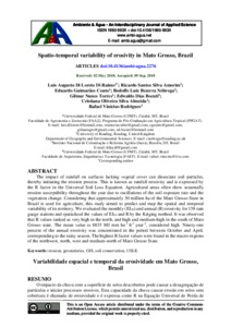 The impact of rainfall on surfaces lacking vegetal cover can dissociate soil particles, thereby initiating the erosion process. This is known as rainfall erosivity and is expressed by the R factor in the Universal Soil Loss Equation. Agricultural areas often show seasonally erosion susceptibility throughout the year due to oscillations of the soil exposure rate and the vegetation change. Considering that approximately 30 million ha of the Mato Grosso State in Brazil is used for agriculture, this study aimed to predict and map the spatial and temporal variability of its territory. We evaluated the monthly (EI30) and annual (R) erosivity for 158 rain gauge stations and spatialized the values of EI30 and R by the Kriging method. It was observed that R values ranked as very high in the north, and high and medium-high in the south of Mato Grosso state. The mean value is 8835 MJ mm ha-1 h-1 year-1, considered high. Ninety-one percent of the annual erosivity was concentrated in the period between October and April, corresponding to the rainy season. The highest R factor values were found in the macro-regions of the northwest, north, west and medium-north of Mato Grosso State.