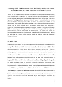 The 2013 Rana Plaza disaster led external stakeholders to insist on higher labour standards in apparel global value chains (GVCs). Stakeholders now expect MNEs to take ‘full-chain’ responsibility. However, the increased monitoring and enforcement costs of a large network of suppliers have been non-trivial. MNEs instead implement a ‘cascading compliance’ approach, coupled with a partial re-internalization. Elevated costs are further exacerbated in developing countries where the informal and formal sector are linked, and cost competitiveness greatly depends on this duality. Monitoring actors in the informal sector is difficult, and few informal actors can achieve compliance. GVCs have therefore reduced informal sector engagement by excluding non-compliant actors and investing in greater automation. By seeking to strictly enforce compliance, MNEs are attenuating some of the positive effects of MNE investment, particularly the prospects for employment creation (especially among women), and enterprise growth in the informal sector. I discuss how these observations might inform other cross-disciplinary work in development, ethics, and sociology. Finally, I note implications for IB theory from the disparities between the ownership, control and responsibility boundaries of the firm.