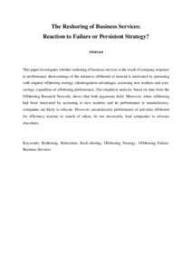 This paper investigates whether reshoring of business services is the result of company response to performance shortcomings of the initiative offshored or instead is motivated by persisting with original offshoring strategy (disintegration advantages, accessing new markets and cost-saving), regardless of offshoring performance. Our empirical analysis, based on data from the Offshoring Research Network, shows that both arguments hold. Moreover, when offshoring had been motivated by accessing to new markets and its performance is unsatisfactory, companies are likely to relocate. However, unsatisfactory performance of activities offshored for efficiency reasons or search of talent, do not necessarily lead companies to relocate elsewhere.